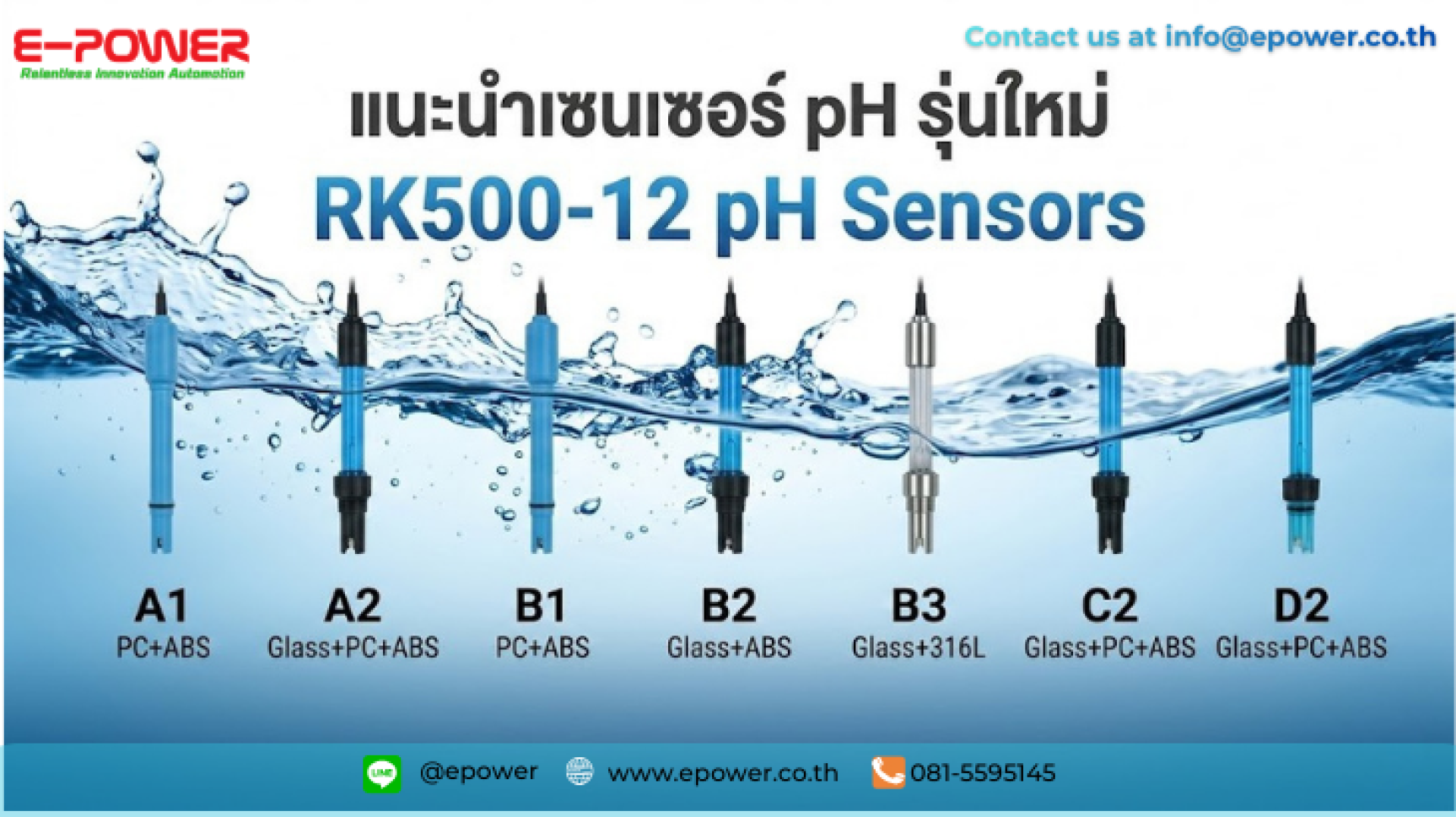 - รุ่นหลากหลาย ตอบโจทย์ทุกการติดตั้ง: จากภาพแนะนำผลิตภัณฑ์ จะเห็นว่ามีรุ่นย่อยตั้งแต่ A1, A2, B1, B2, B3, C2 ไปจนถึง D2 ซึ่งมีการเลือกใช้วัสดุปลอกและปลายเซนเซอร์ที่ต่างกัน (เช่น PC+ABS, Glass+316L, Glass+ABS) เพื่อให้เหมาะสมกับโครงสร้างการติดตั้งและประเภทของของเหลวที่คุณต้องการวัดมากที่สุด