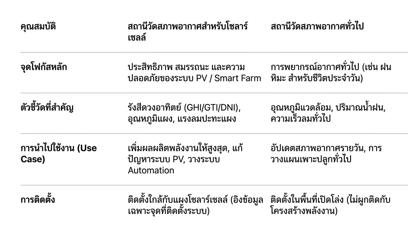 ตารางเปรียบเทียบ: สถานีวัดสภาพอากาศสำหรับโซลาร์เซลล์ vs. สถานีวัดสภาพอากาศทั่วไป
