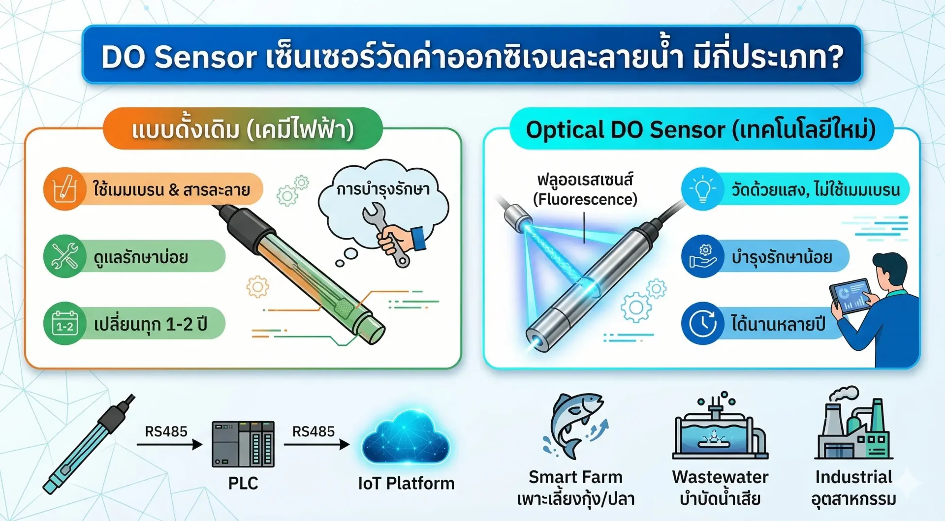 DO Sensor เซ็นเซอร์วัดค่าออกซิเจนละลายน้ำ ที่คุณใช้อยู่ ต้องคอยเปลี่ยนทุก 1-2 ปีและบำรุงรักษาบ่อยๆ อยู่หรือเปล่า? หากใช่ ถึงเวลาทำความรู้จักกับ Optical DO Sensor รุ่นใหม่ที่ใช้งานได้ยาวนานหลายปีแบบไม่ต้องปวดหัวเรื่องการดูแล ไม่ว่าคุณจะทำระบบ Smart Farm , เพาะเลี้ยงสัตว์น้ำ หรือ Automation โรงบำบัดน้ำเสีย การมี Water Quality Sensor ที่แม่นยำและทนทานคือคีย์หลักที่ช่วยให้การดึงข้อมูลเข้า IoT Platform หรือสั่งงาน PLC ไหลลื่นไม่มีสะดุด มาร่วมเจาะลึกประเภทของเซ็นเซอร์วัด DO และวิธีเลือกซื้อให้ตอบโจทย์ระบบอัตโนมัติของคุณในบทความนี้กัน