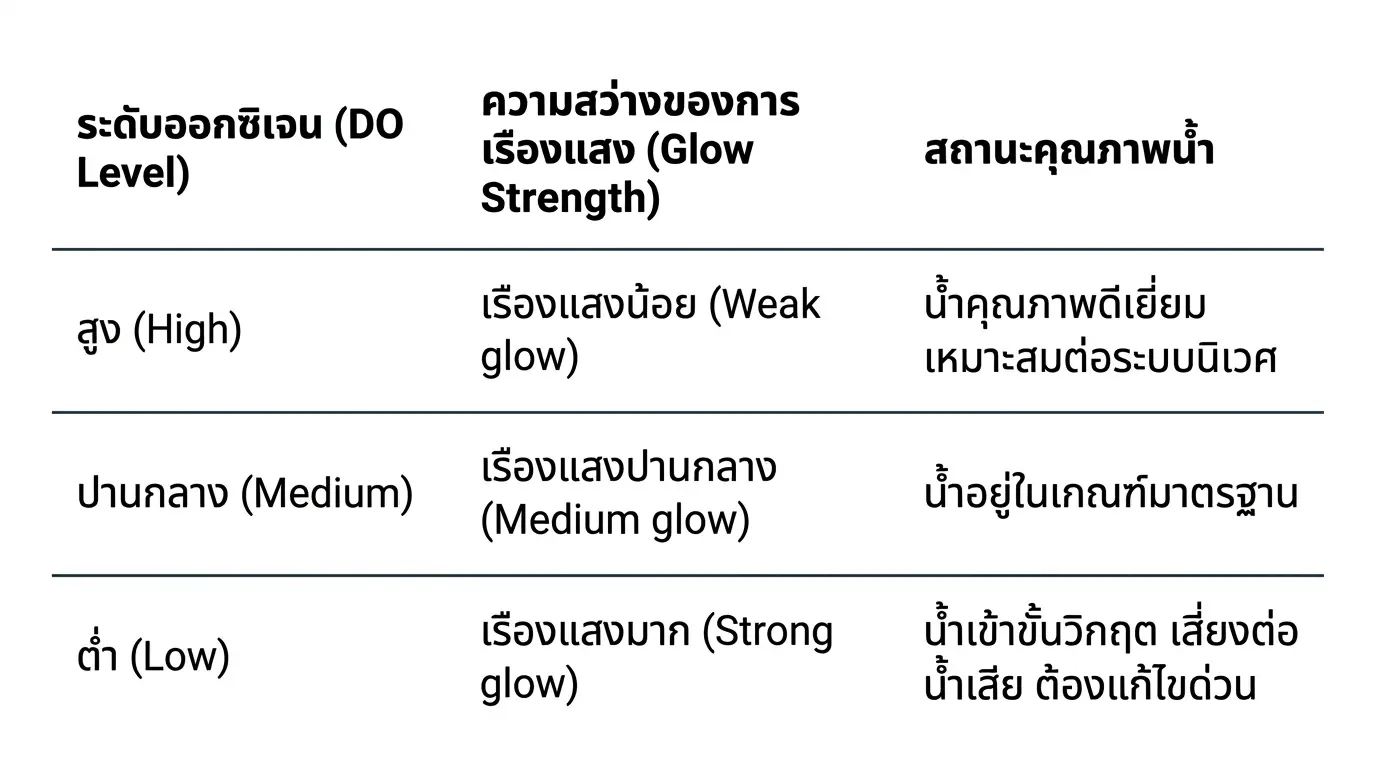 - การตรวจจับ: โมเลกุลออกซิเจนในน้ำจะพุ่งเข้าชนสารเคลือบและดึงพลังงานไป ทำให้แสงสีแดงอ่อนกำลังลง