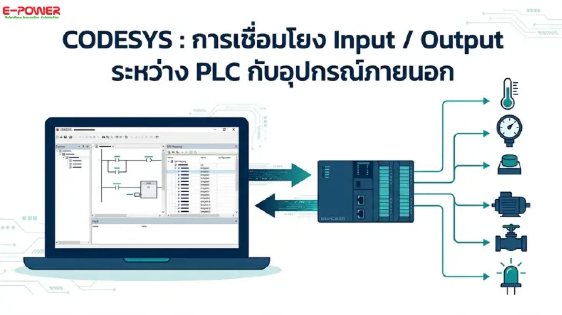 CODESYS เป็นโปรแกรม PLC ระดับโลก (IEC 61131-3) ที่ถูกออกแบบมาเพื่อพัฒนาระบบ Industrial Automation ให้สมบูรณ์แบบ โดยขั้นตอนที่พลาดไม่ได้คือ "การเชื่อมโยง Input / Output ระหว่าง PLC กับอุปกรณ์ภายนอก เพื่อให้ระบบควบคุมทำงานได้อย่างถูกต้องและแม่นยำ" เพราะหากตั้งค่า I/O ผิดพลาด ย่อมส่งผลเสียต่อการทำงานของเครื่องจักรโดยตรง วันนี้ E-Power Service จะมาสอนวิธีตรวจสอบและ Mapping I/O อย่างถูกวิธีผ่านซอฟต์แวร์ CODESYS โดยใช้ฮาร์ดแวร์จริงอย่าง PLC รุ่น EC201S LicOS มาเป็นตัวอย่างแบบ Step-by-Step ให้คุณเรียนรู้และทำตามได้ทันที