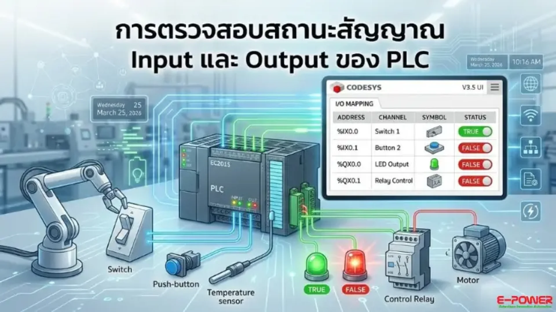 วันนี้ E-Power Service จะมาแนะนำขั้นตอนง่ายๆ ในการเช็คสถานะ I/O ของ PLC โดยใช้ซอฟต์แวร์ระดับสากลอย่าง CODESYS (ตัวอย่างการใช้งานร่วมกับ EC201S PLC) มาดูกันว่าต้องทำอย่างไรบ้าง