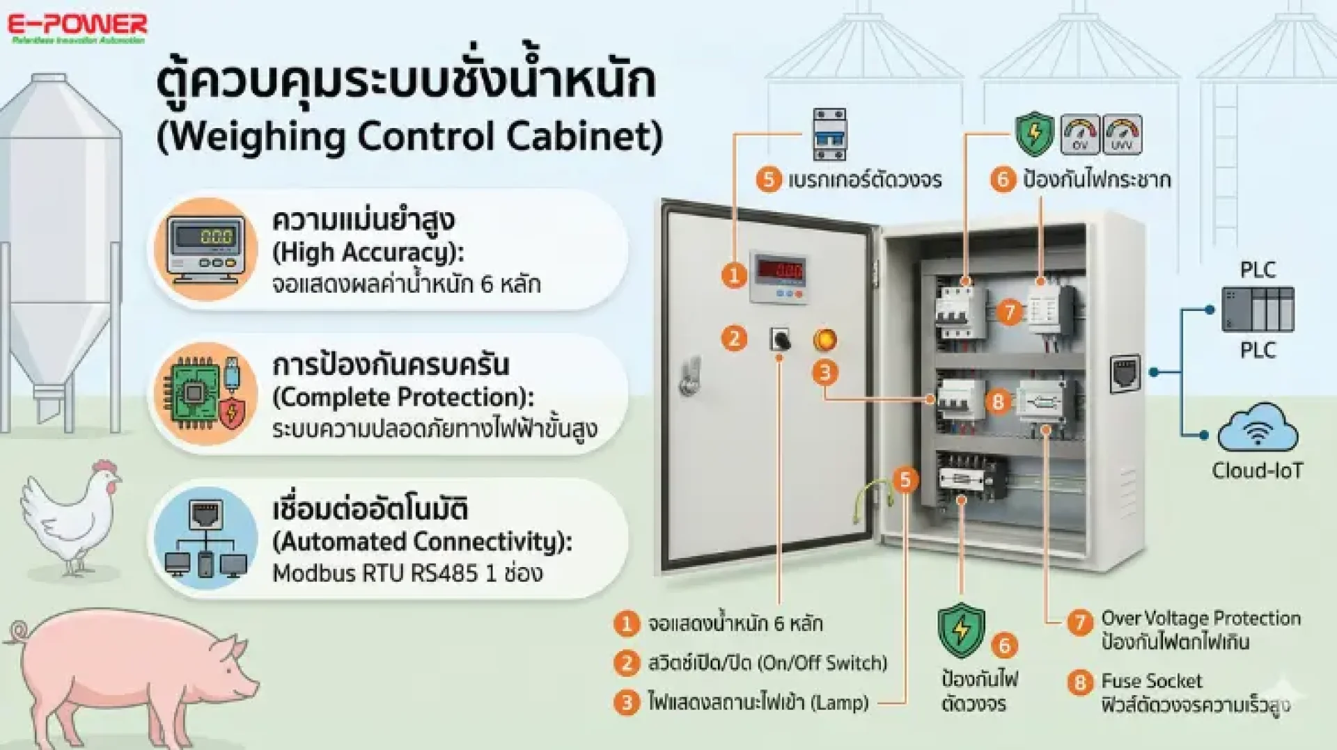 ตู้ควบคุมระบบชั่งน้ำหนัก (WEIGHING CONTROL) จาก E-Power Service ถูกออกแบบมาเพื่อรองรับการทำงานหนักในสภาพแวดล้อมจริง ตอบโจทย์การบริหารจัดการ ระบบอัตโนมัติ (Automation) ในโรงงานอุตสาหกรรม โรงงานอาหารสัตว์ และ ระบบสมาร์ทฟาร์ม ที่ต้องการจัดการวัตถุดิบในไซโลอย่างแม่นยำ ด้วยอุปกรณ์แสดงผลที่ครบครันและระบบป้องกันความปลอดภัยทางไฟฟ้าขั้นสูง โซลูชันนี้จึงเป็นกุญแจสำคัญที่ช่วยลดต้นทุน เพิ่มประสิทธิภาพการผลิต และทำให้ระบบของคุณทำงานได้อย่างมีเสถียรภาพ