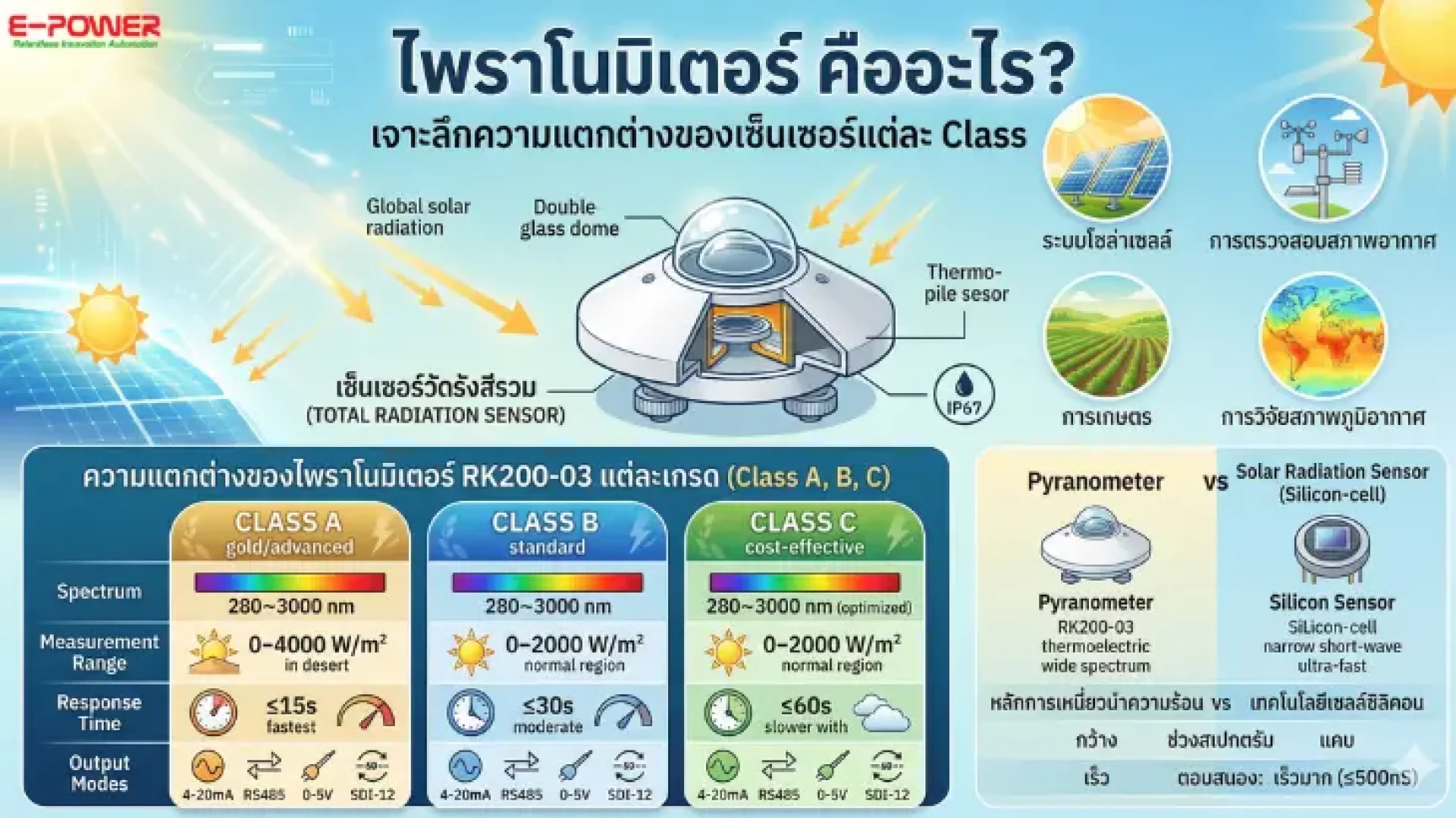 ไพราโนมิเตอร์ (Pyranometer) แต่ละเกรดแตกต่างกันอย่างไร? คู่มือเลือก เซ็นเซอร์วัดรังสีดวงอาทิตย์ ให้ตอบโจทย์
