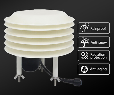 เซ็นเซอร์ชิ้นสำคัญสำหรับสถานีตรวจอากาศและสมาร์ทฟาร์ม มาพร้อมฝาครอบกันรังสี (Solar Radiation Shield) ระดับ IP68 ป้องกันแสงแดด ลม และฝนได้อย่างมีประสิทธิภาพ ทนทานต่อสภาพอากาศที่รุนแรง