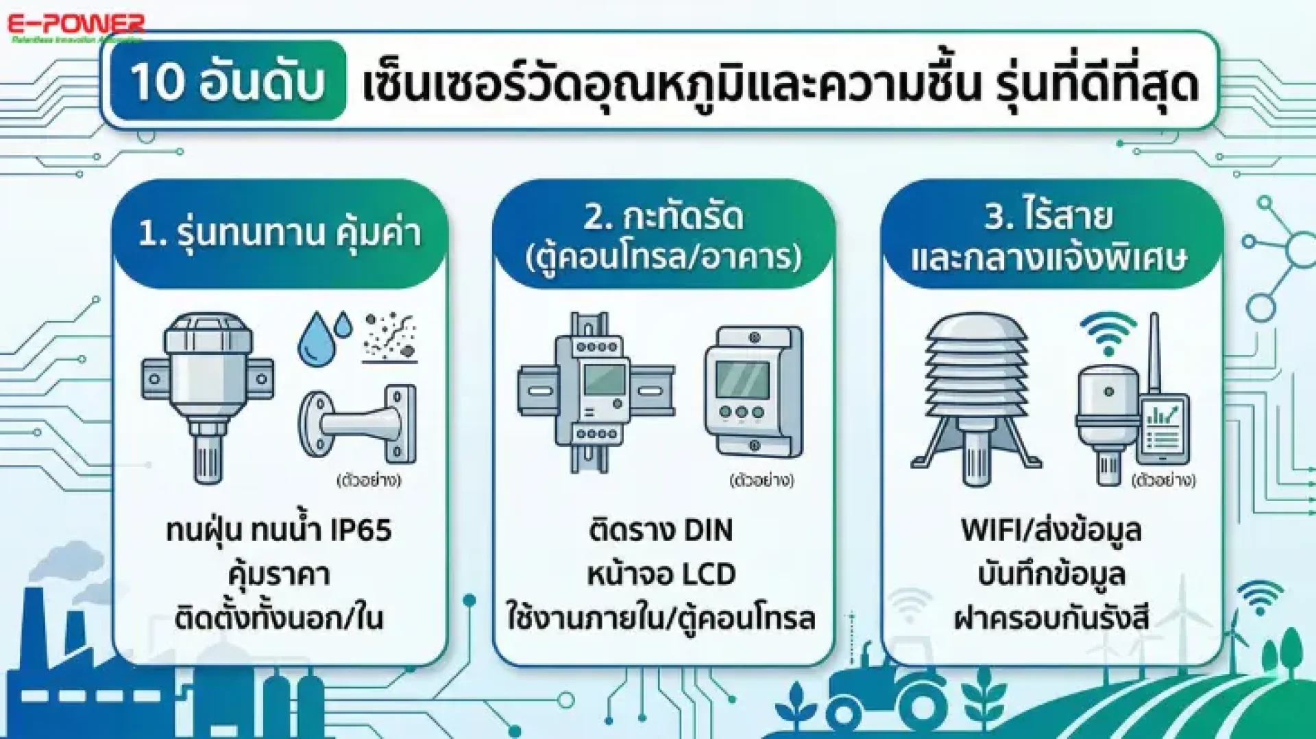 หากคุณกำลังวางแผนอัปเกรดระบบอุตสาหกรรมหรือ Smart Farm บริษัท อี-พาวเวอร์ เซอร์วิส จำกัด พร้อมเป็นที่ปรึกษาในการออกแบบระบบ Industrial Automation และเชื่อมต่อเซ็นเซอร์คุณภาพสูงเหล่านี้เข้ากับแพลตฟอร์ม IoT อย่างครบวงจร เพื่อเพิ่มประสิทธิภาพสูงสุดให้กับธุรกิจของคุณ เข้าชมรายละเอียดเพิ่มเติมได้ที่ www.epower.co.th