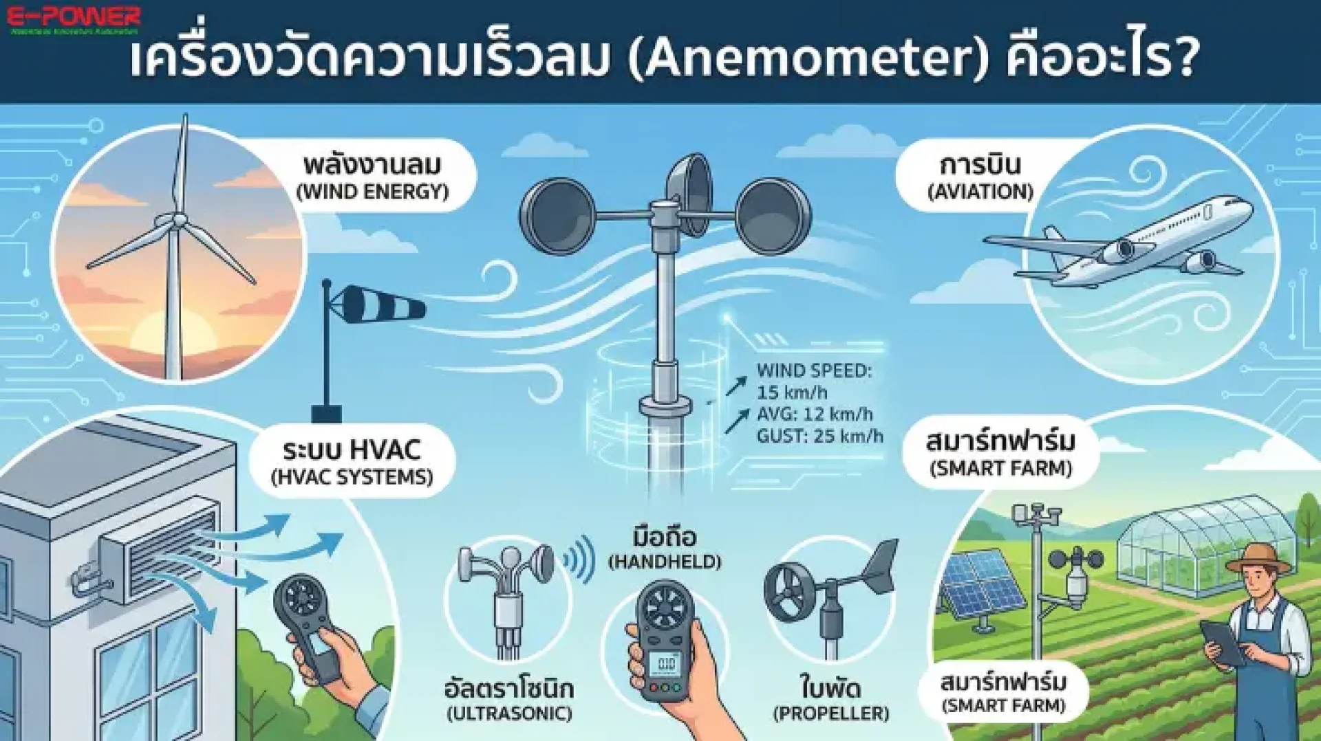 เครื่องวัดความเร็วลม แต่ละประเภทมีจุดเด่นที่ต่างกัน การเลือกใช้ที่ถูกต้องจะช่วยให้คุณได้ข้อมูลลมที่แม่นยำเพื่อเพิ่มประสิทธิภาพในงานของคุณ หากคุณกำลังมองหาโซลูชัน เครื่องวัดความเร็วลม เกรดอุตสาหกรรม หรือระบบสถานีตรวจอากาศอัจฉริยะ บริษัท อี-พาวเวอร์ เซอร์วิส จำกัด พร้อมมอบบริการออกแบบและติดตั้งครบวงจร เข้าชมสินค้าได้ที่ www.epower.co.th