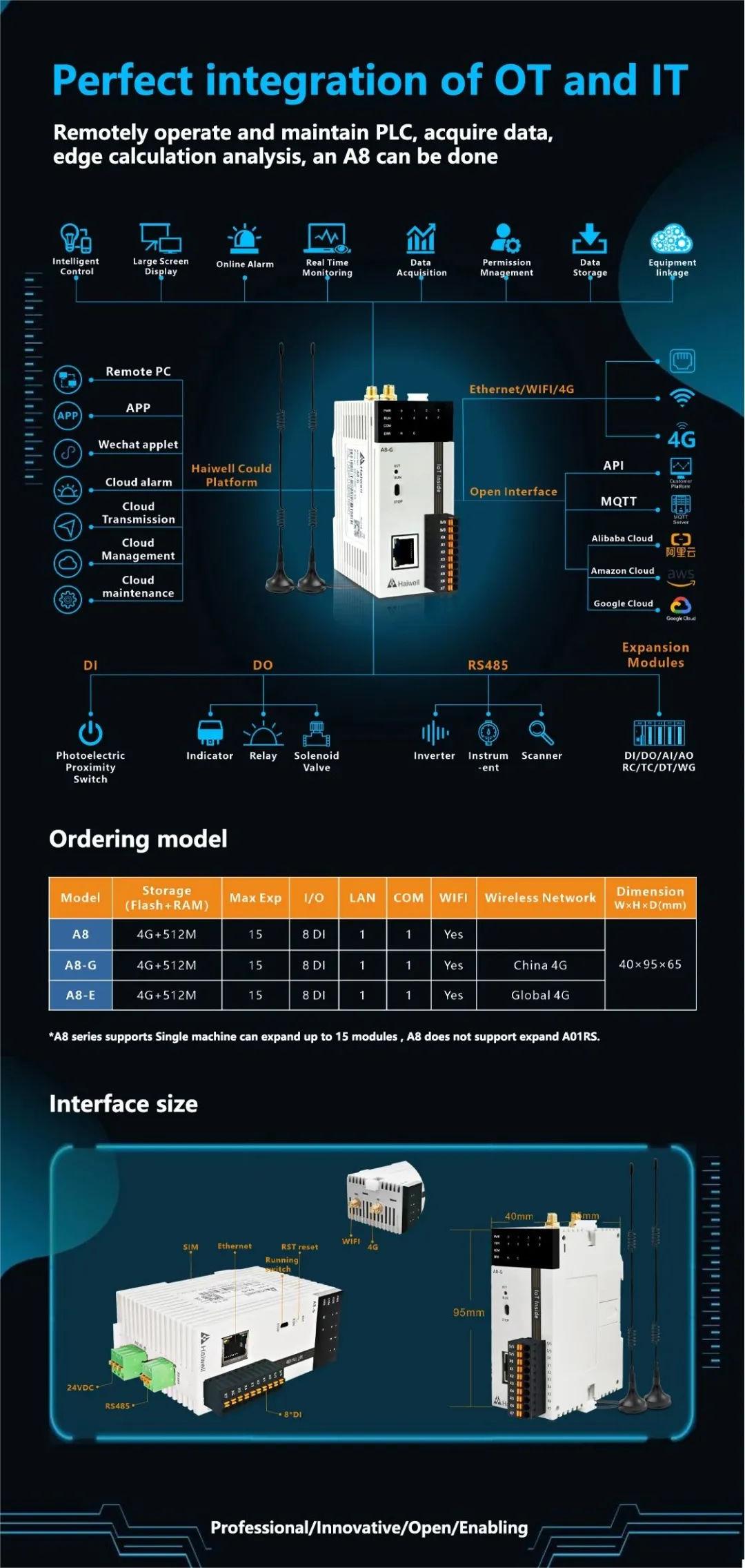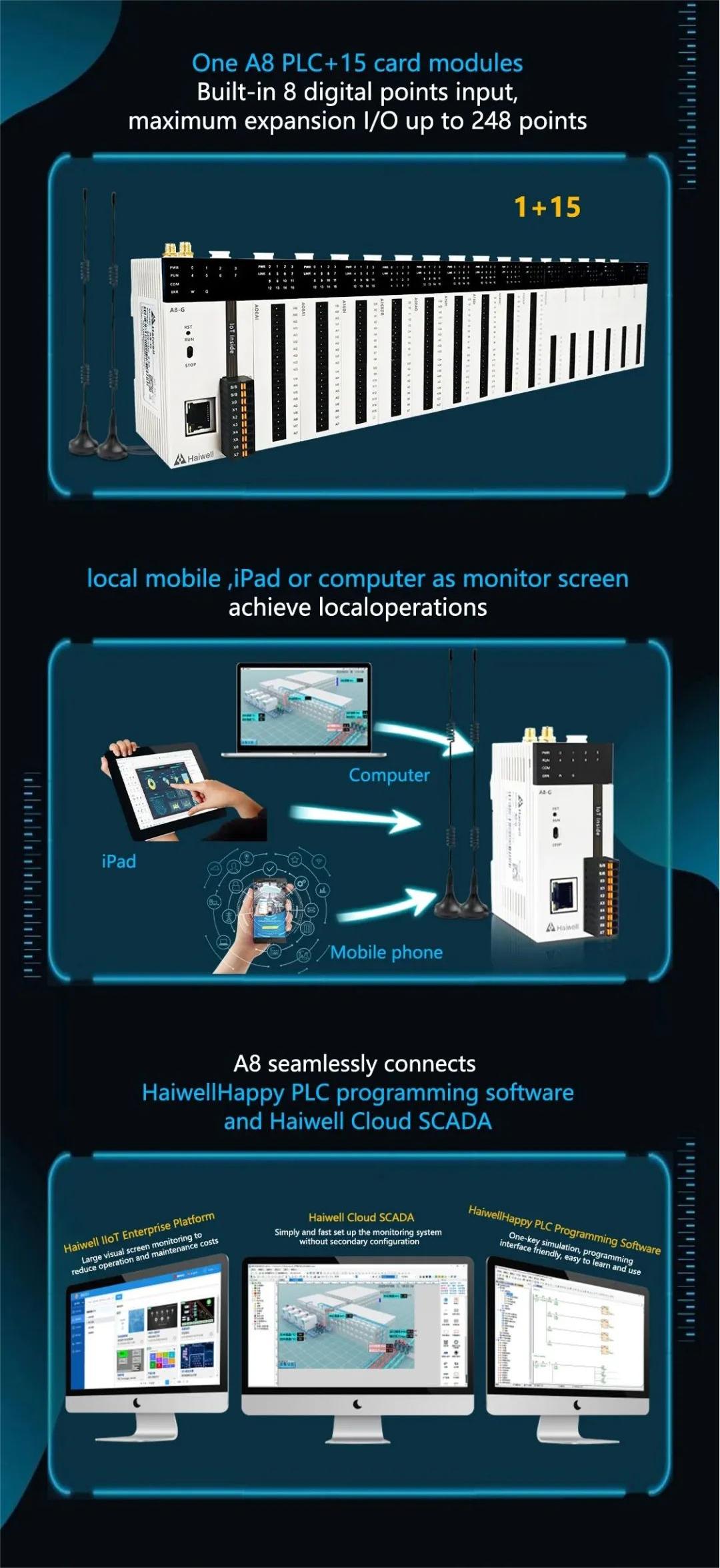 A8 รองรับฟังก์ชั่นทั้งหมดของ PLC และ HMI ในขณะเดียวกัน ยังสามารถขยายโมดูล PLC ซีรีส์ A จำนวน 15 โมดูล ผ่านทางซอฟต์แวร์การเขียนโปรแกรม Haiwell Happy PLC และ Haiwell Cloud SCADA สำหรับการจัดการการเขียนโปรแกรม สามารถเชื่อมต่อกับแพลตฟอร์มคลาวด์ Haiwell Internet of Things (IoT) ผ่าน WiFi/ 4G/ อีเธอร์เน็ต และเชื่อมต่อกับ Alibaba Cloud, Amazon Cloud และแพลตฟอร์ม IoT หลักอื่นๆ ผ่านโปรโตคอล MQTT เพื่อให้สามารถใช้ประโยชน์จากความสามารถ IoT ของอุปกรณ์ได้อย่างเต็มที่ และ ช่วยให้องค์กรต่างๆ ตระหนักถึงการก้าวกระโดดจากข้อมูลโรงงานแบบดั้งเดิมไปสู่ข้อมูลระยะไกลบนคลาวด์ การตรวจสอบและการจัดการอุปกรณ์ที่มีประสิทธิภาพมากขึ้นและการกำหนดเวลาทรัพยากรการผลิตจะช่วยปรับปรุงประสิทธิภาพการดำเนินงานของได้อย่างมากงานอุตสาหกรรม ถือเป็นก้าวสำคัญสู่การผลิตอัจฉริยะ