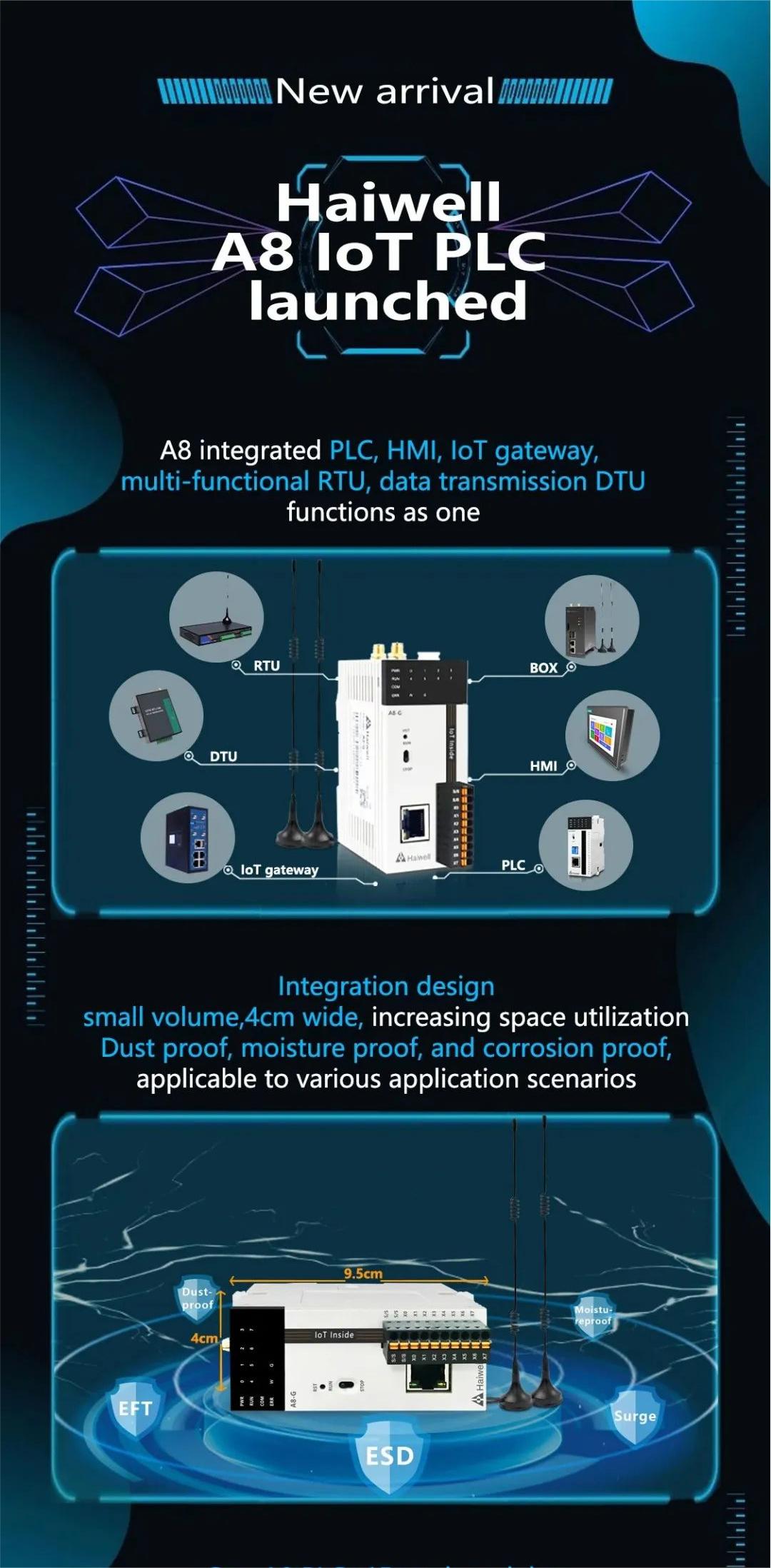 IoT PLC ซีรีส์ A8 เป็น Internet of Things PLC ขนาดเล็กขนาดกะทัดรัด เนื่องจาก HaiwellThailand เปิดตัวผลิตภัณฑ์ประสิทธิภาพสูงด้านต้นทุน PLC แบบรวม A8, HMI, เกตเวย์ IoT, RTU อเนกประสงค์, การส่งข้อมูล DTU ทำหน้าที่เป็นหนึ่งเดียว โดยไม่ต้องใช้โมดูล IoT ภายนอก การออกแบบการรวม PLC, BOX ใช้พื้นที่ติดตั้งน้อย และเพิ่มพื้นที่ให้กับตู้ควบคุม ทำให้การเดินสายไฟง่ายขึ้นอย่างมาก และลดต้นทุนการดำเนินงานและการบำรุงรักษา อุปกรณ์หนึ่งเครื่องสามารถทำงานระยะไกลได้ และการบำรุงรักษา PLC ทำได้ง่าย การเก็บข้อมูล การคำนวณและการวิเคราะห์ Edge Computing ทำได้อย่างง่ายดาย เพื่อให้วิศวกรประหยัดเวลาในการทำงาน และสามารถทำงานได้ทุกที่โดยไม่ต้องกังวล