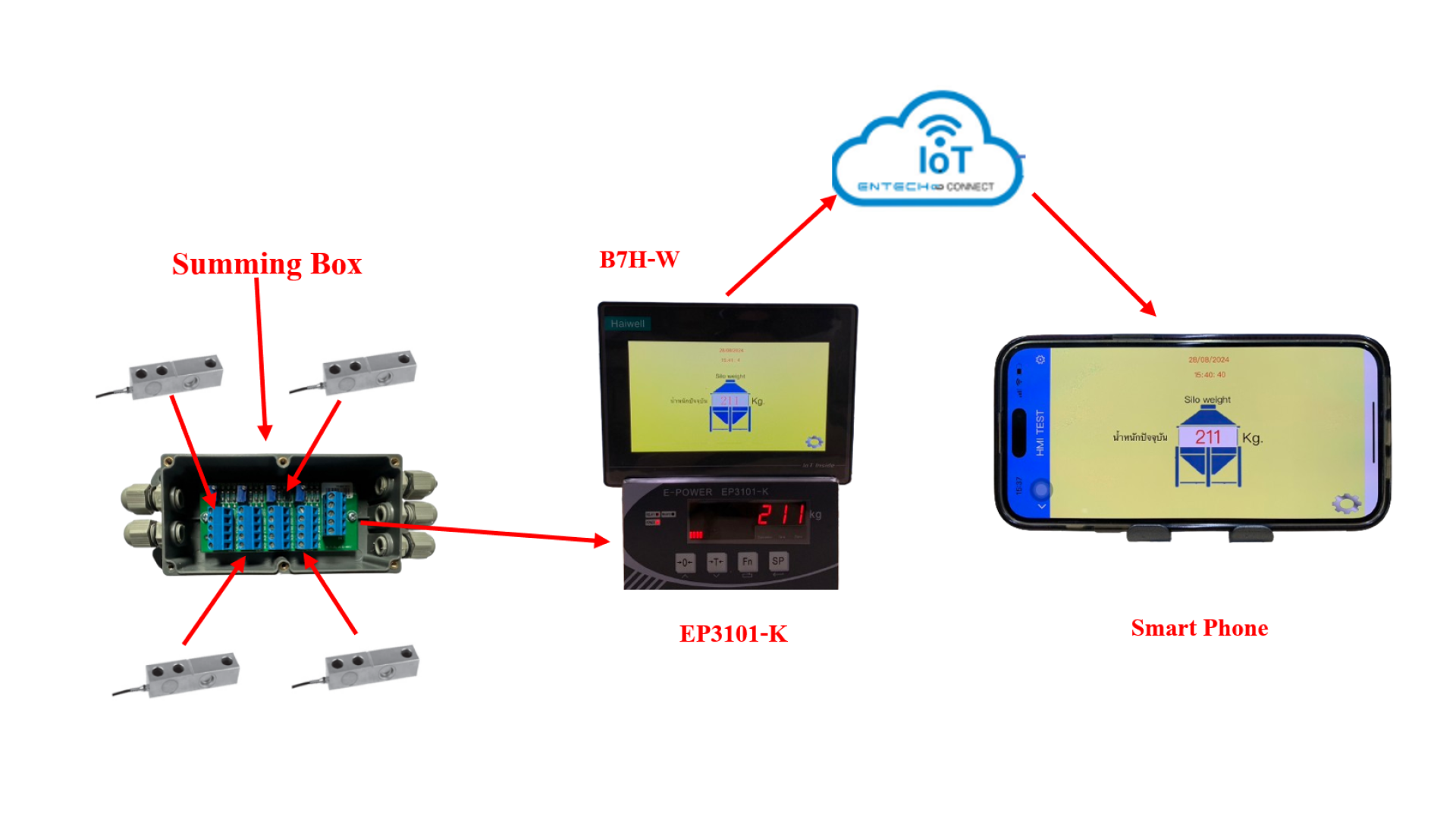 Indicator EP3101-K สามารถเชื่อมต่อกับอุปกรณ์อื่นๆได้ โดยใช้ พอร์ตสื่อสาร RS232/485 เพื่อนำค่าน้ำหนักที่แสดงผลไปใช้งานไม่ว่าจะเป็น SCOREBOARD DISPLAY , PLC , HMI เป็นต้น และยังสามารถแสดงค่าน้ำหนักบนมือถือหรือคอมพิวเตอร์ได้ด้วยระบบ IoT โดยการเชื่อมต่อกับ HMI B7H-W (Haiwell) โดยผ่านระบบ Haiwell Cloud