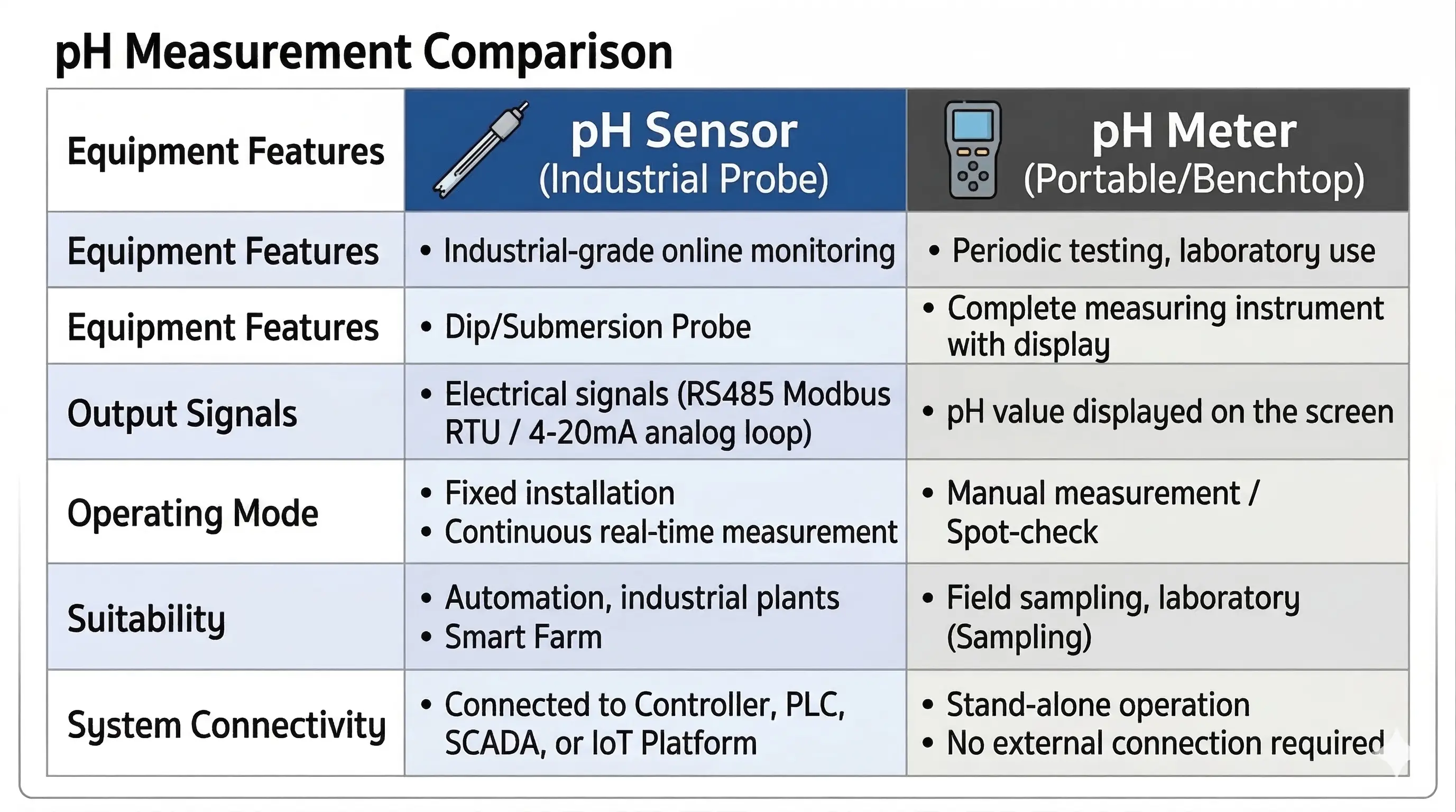 - Chemical Production: Use a Meter for batch testing, but use a pH Sensor for real-time ratio control inside reaction tanks.