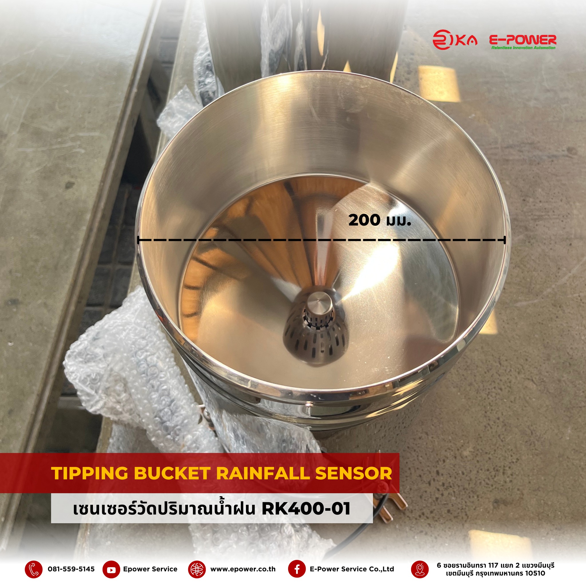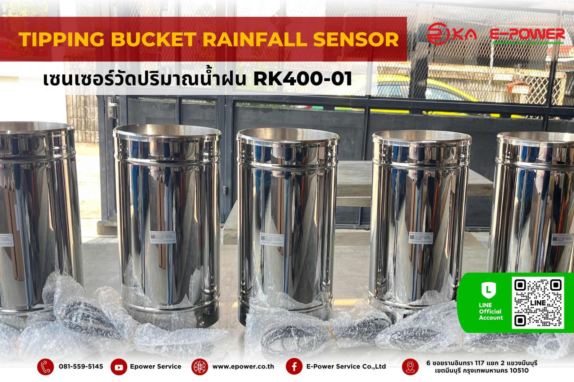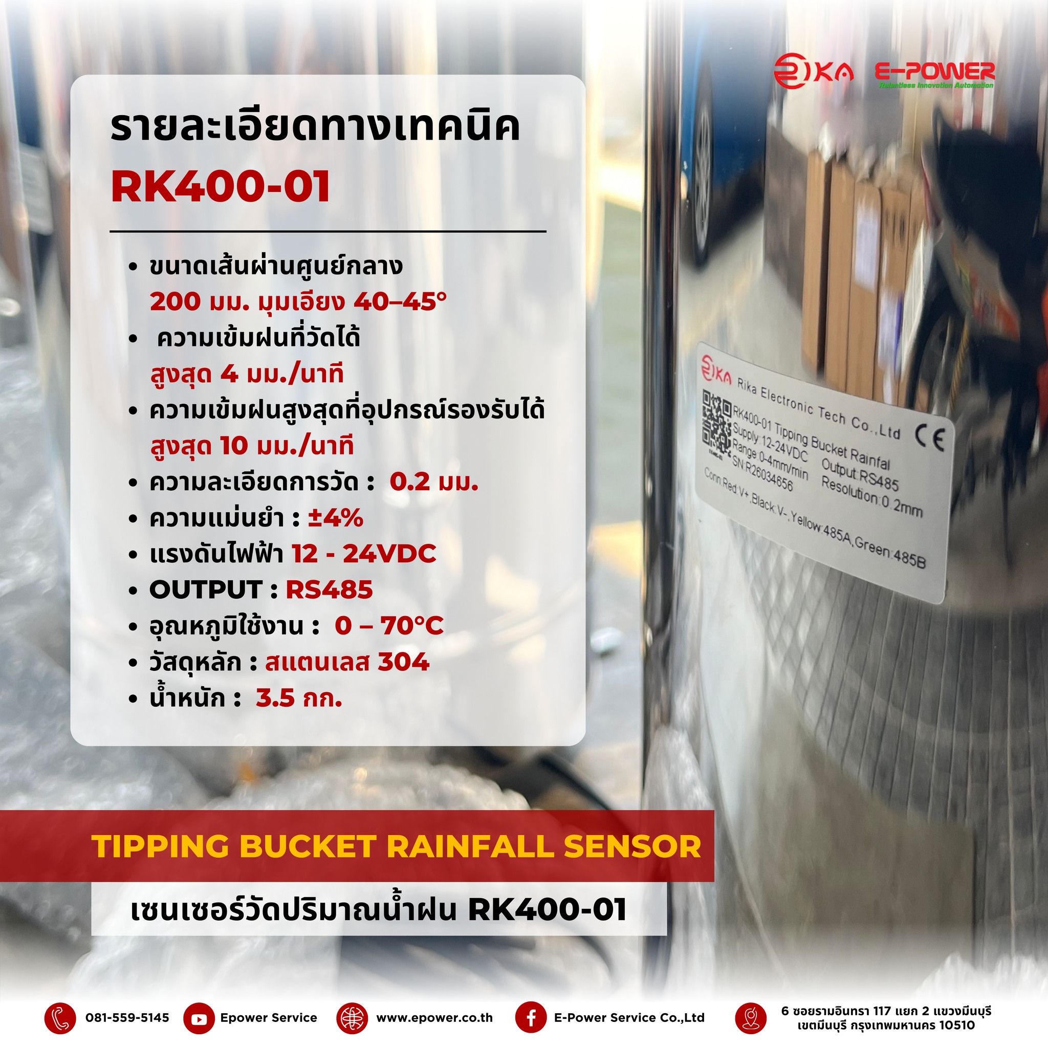 The RK400-01 Rainfall Sensor is an industrial-grade measurement device trusted by engineers and Smart Farm developers nationwide. E-Power Service Co., Ltd. is proud to present this Tipping Bucket Rainfall Sensor solution, specifically designed for accurate and reliable rainfall data collection for weather analysis and efficient water resource management.