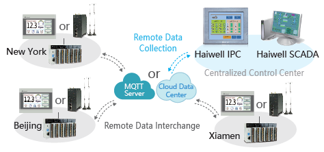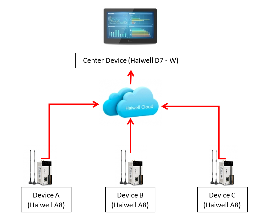 Haiwell Cloud Data Center is a centralized and wireless multi-point data exchange and management service. As long as you use the end device as Haiwell IoT, you can exchange this data from the center through Haiwell Cloud Data Center. Thus, you can connect and collect any HaiwellHMI data to the central HMI. The collected data will be sent via the Internet to which the HMI is connected. For example, we have a device as Center Device, HaiwellHMI(A), HaiwellHMI(B), and HaiwellHMI(C). If we want to send data from HMI B and C to display on device A, we can do it through "Haiwell cloud Data Center".