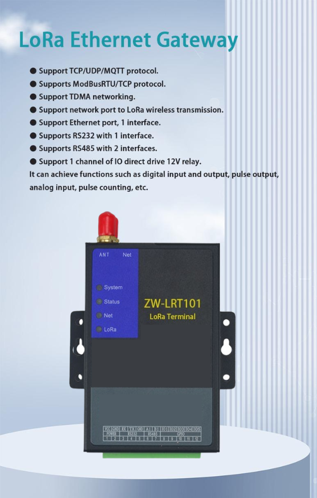 ZW-LRT101 is a LoRa gateway for wired Ethernet, supporting TCP/UDP and TDMA networking.