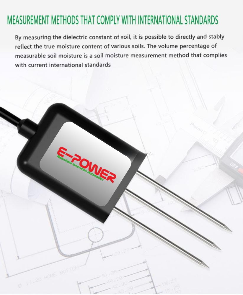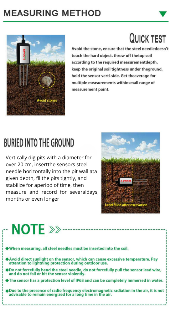 | Detection accuracy | ±2% within 0-50%, @ (brown soil, 30%, 25) ±3% within 50-100%, @ (brown soil, 60%, 25) |