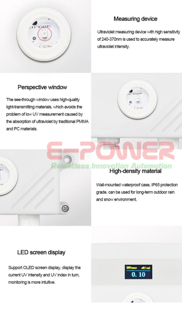 This product is based on the principle of converting ultraviolet rays into measurable electrical signals using photosensitive elements. The product integrates temperature and humidity sensors, providing more comprehensive measurement data. The product shell is a wall mounted high protection level shell, with a protection level of IP65 and rain and snow resistance.