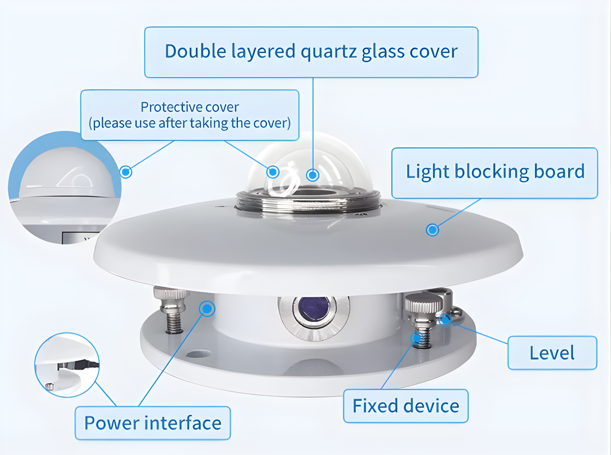 The EPS-TBQ-2C Total Radiation Pyranometer is primarily used as a Class 1 instrument for measuring total solar radiation within the wavelength range of 0.3–3.2 micrometers. This pyranometer consists of a double-layer quartz glass cover, sensing elements, a sunshield, and a desiccant chamber within the housing. The following sections will illustrate its key structural components, providing a clearer understanding of the product’s internal construction and fundamental performance characteristics.